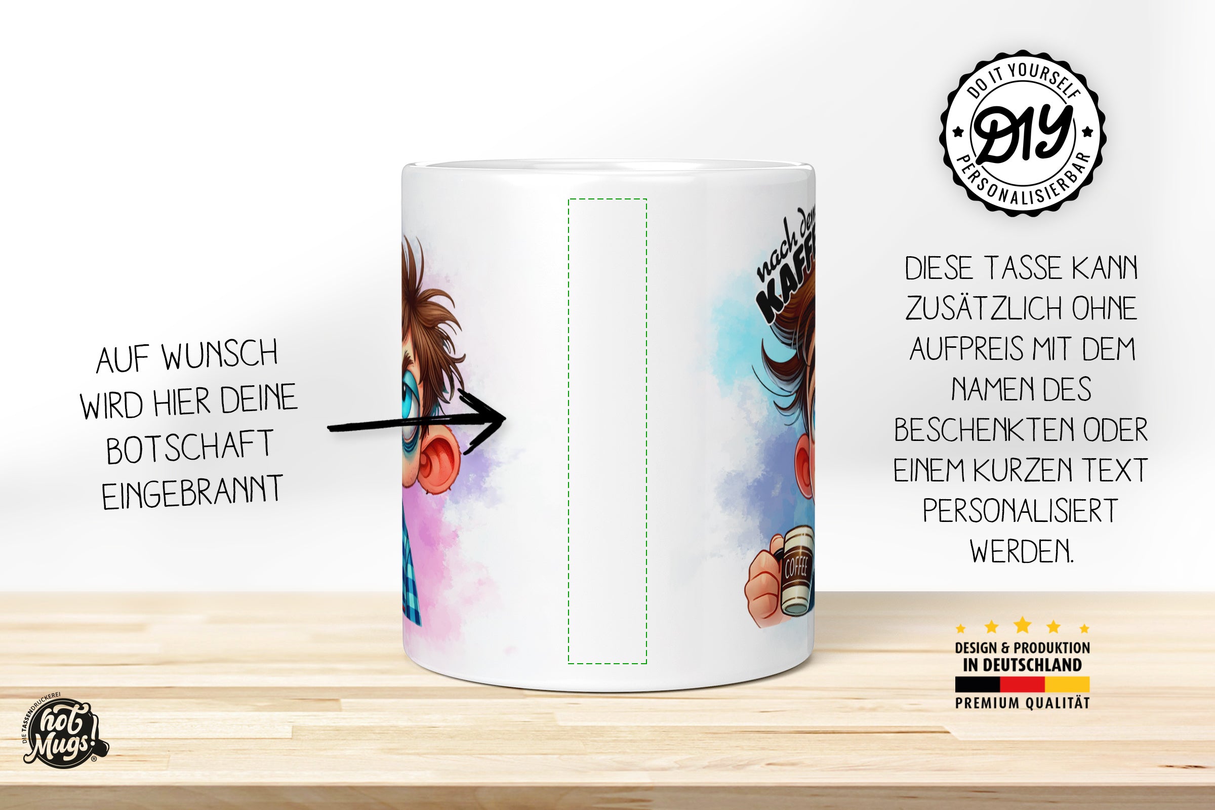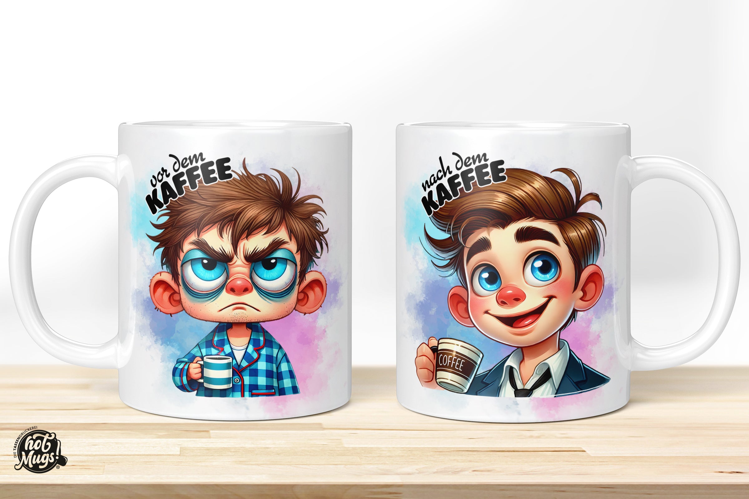 Frisch bedruckt kommt diese Tasse auf Deinen Tisch. In kräftigen Farben und spülmaschinenfest, damit Du lange Freude daran hast. Das Motiv „Vor / Nach dem Kaffee – Mann“ wird im hochwertigen Sublimationsdruck in die Keramiktasse eingebrannt und ist ein Hingucker beim Frühstück, im Büro oder im Verein. Auch als Geschenkidee eignen sich unsere Motivtassen bestens! Zum Geburtstag, Jahrestag, für den neuen Job oder als kleine Liebesbotschaft. Bedruckte Tassen aus der HotMugs-Tassendruckerei zaubern garantiert ein Lächeln auf die Lippen und werden gerne benutzt.